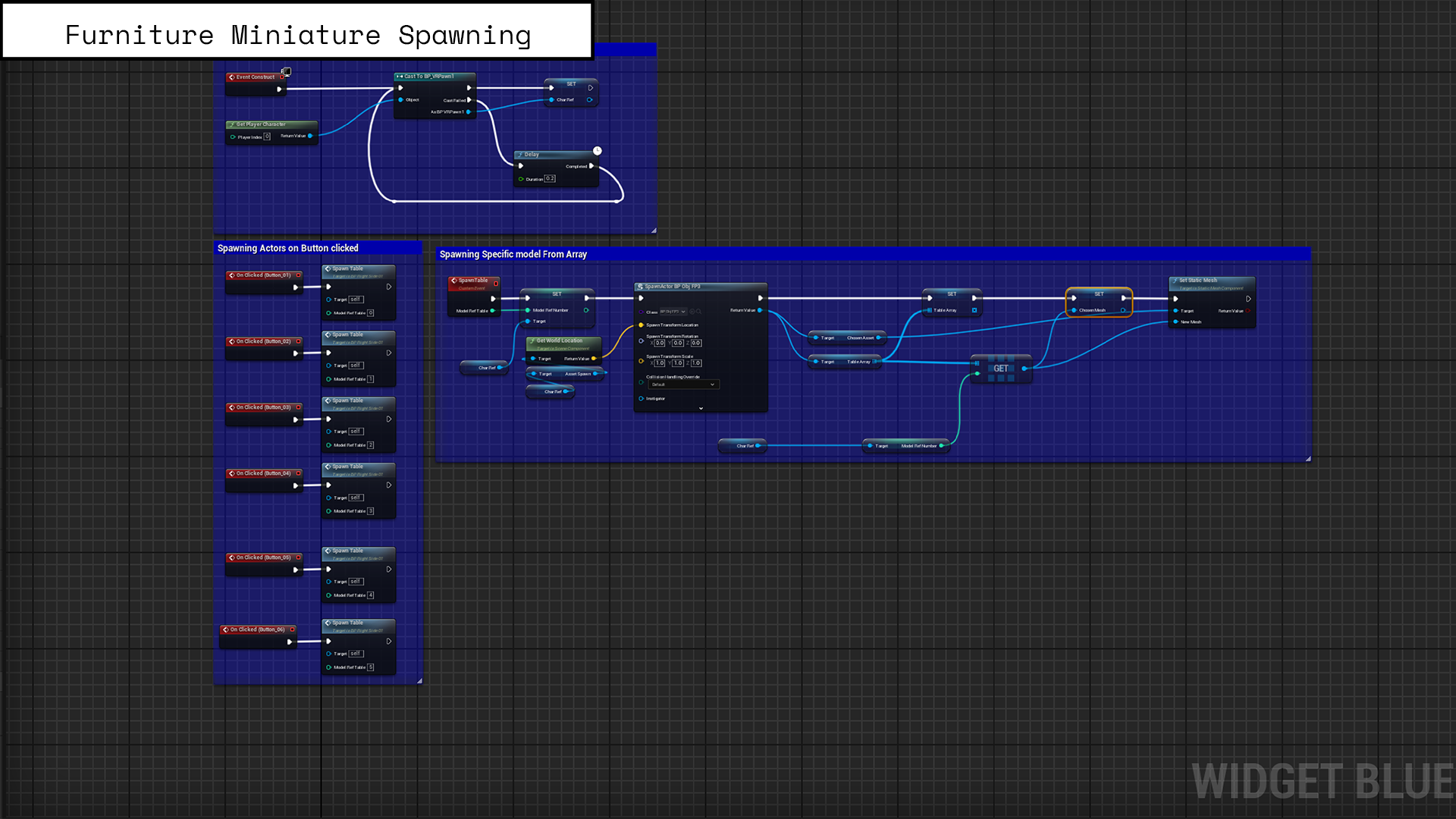 In this Widget BP, clicking a furniture asset button triggers a custom event that spawns the actor at a marked location relative to the player. The furniture static meshes are in an array, and the button clicked determines which asset is selected and sets the static mesh.