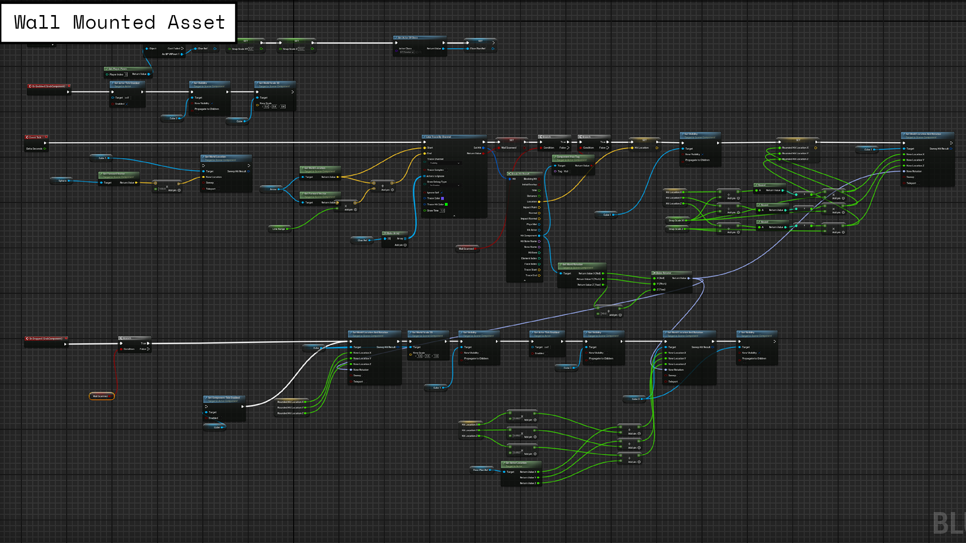 For this BP, I set the wall-mounted asset's location. On tick, a line trace by channel hits from the back, setting both full-scale and miniature assets at the hit location. The miniature location is normalized. Tick is enabled “on grab” and disabled “on dropped” for optimization.