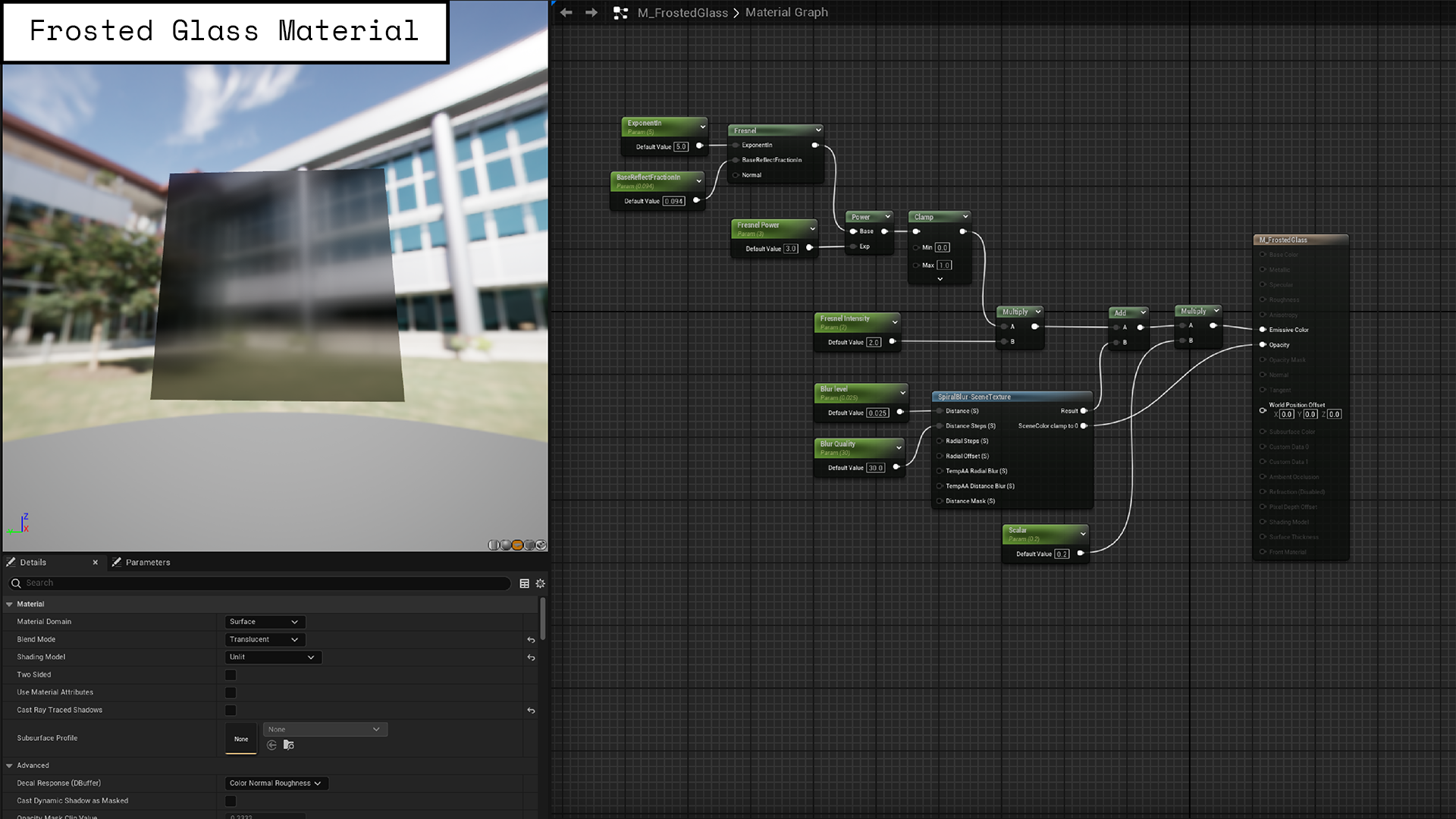 This material aims to replicate frosted glass, designed not to be affected by light as it's a UI element. A Fresnel node creates a white emissive to simulate edge shine, while a spiral blur is applied to the opacity to mimic the blurred effect characteristic of frosted glass.